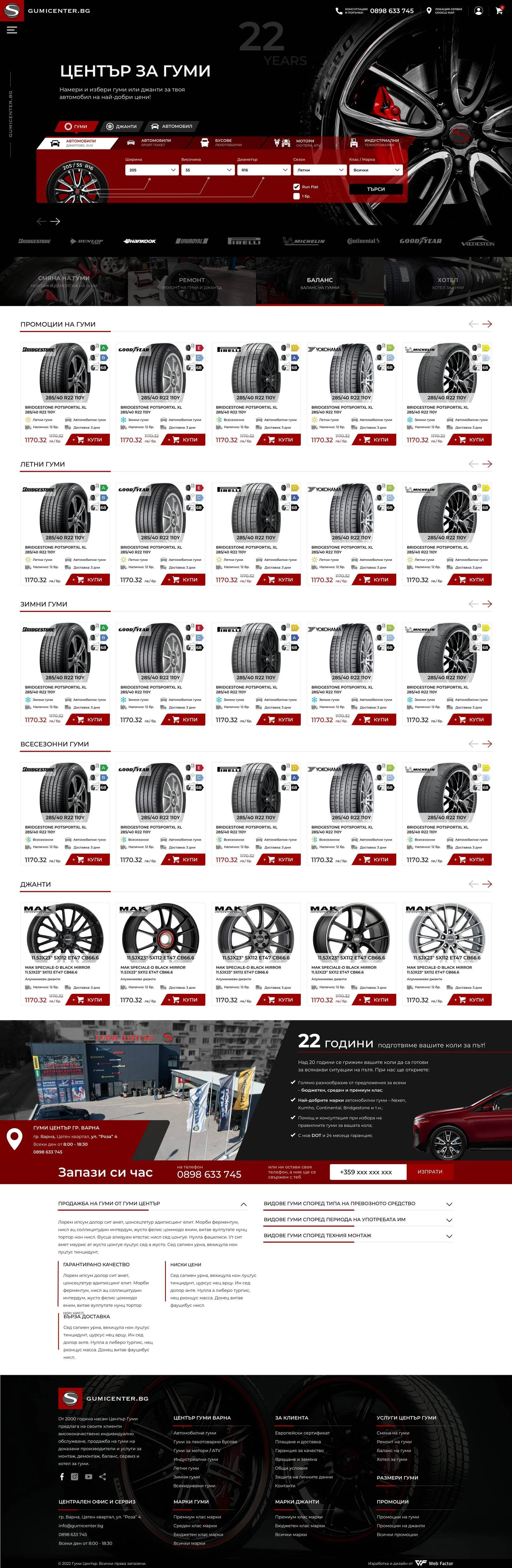 Уеб сайтът ви дава възможността да избирате между най-добрите марки гуми на пазара, без значение какъв е вашият автомобил и изискванията ви. В сайта ще откриете разнообразие от продукти и от услуги като монтаж, демонтаж и смяна на гумите на най-добри цени. Поръчката на вашите гуми е лесна и удобна - просто разгледайте каталога и поръчайте онлайн с няколко клика.